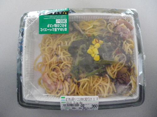 早出の朝 昨夜の就寝前は『吉野家』で、牛鍋丼でも食おうと思っていたが、朝起床するとそこまで食欲は沸かない 出勤前に『ファミマ』へ立ち寄り、目に付いたほうれん草とベーコンときのこの和パスタ 360円を購入 いそいそと出社し、早速朝食 外観 ラップを取…