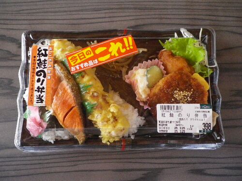 連休開けの月曜日 外回りの途中、ゴミネット回収の為に一旦帰宅 家族が不在なのも不便なもんだ 折角なんで、近所のスーパー『いとく』で購入した弁当で昼食 紅鮭のり弁当 398円 外観 普段、スーパーの弁当って食べる機会が無いので、一寸楽しみ♪ お茶の準備…