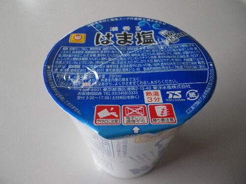 早出の金曜日 仕事も一段落して、とりあえず買い置きしておいたこちらで朝食 『マルちゃん』HOT NOODLE 潮香るはま塩 94円 外観 中身 熱湯を注いで3分後、完成 結構美味そう ではスープを一口、Zuzu… うん、なかなか美味しい では麺を、ズルズル… まぁ、普通の…