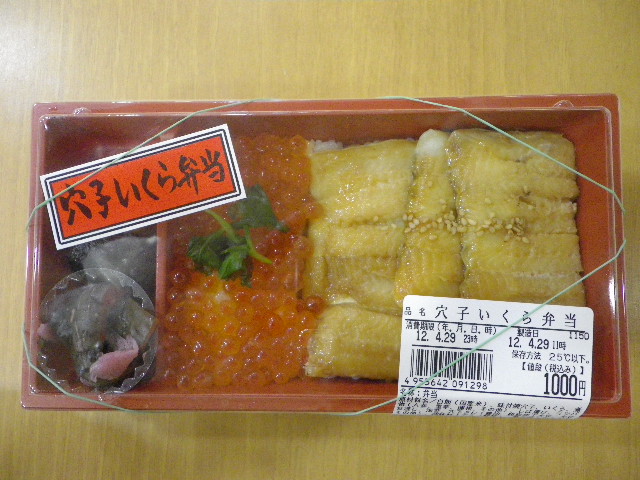 2012-05-11 24.4.29 『盛岡駅』穴子いくら弁当 ●駅弁 #食べ物 東京滞在3日目の夜 東京駅を発車した「やまびこ」は予定の時刻に盛岡駅到着 高速バスへの乗り換えの間、売店を覗く 残った駅弁が数個、半額になっている 『日本レストランエンタープライズ』 穴子いくら弁当 1,000円→500円を購入 帰宅後、自宅で弁当を開く 外観 中身 まず、いくら部分を一口、パク、モグモグ… 程良い塩加減のいくらで美味い では、穴子を一口、パク、モグモグ… ふっくらとした食感で味付けも美味しい 付け合せは煮しめと漬物 量は少ない 難無く完食。ふぅ、ご馳走様! これにて東京出張終了