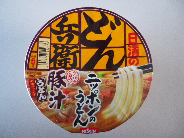 2012-10-30 24.10.18 『日清』どん兵衛 豚汁うどん ●カップ麺 #食べ物 早出の朝 秋も深まり、ようやくカップ麺の美味しい季節となった 会社で一仕事してから朝食 前日買い置きしておいたカップ麺 『日清』どん兵衛 豚汁うどん 118円 外観 中身 熱湯を注いで、5分後 よくかき回して完成 ではスープを一口、Zuzu… お!これは美味い! スープの色から薄味なのはわかっていたが、ダシがなかなか美味しい 麺はどん兵衛ならではの、いつもの麺 この麺は結構好きだ 具は豚肉、ごぼう、刻み揚げ お揚げが美味しい 量は普通 難無く完食。ふぅ、ご馳走様!